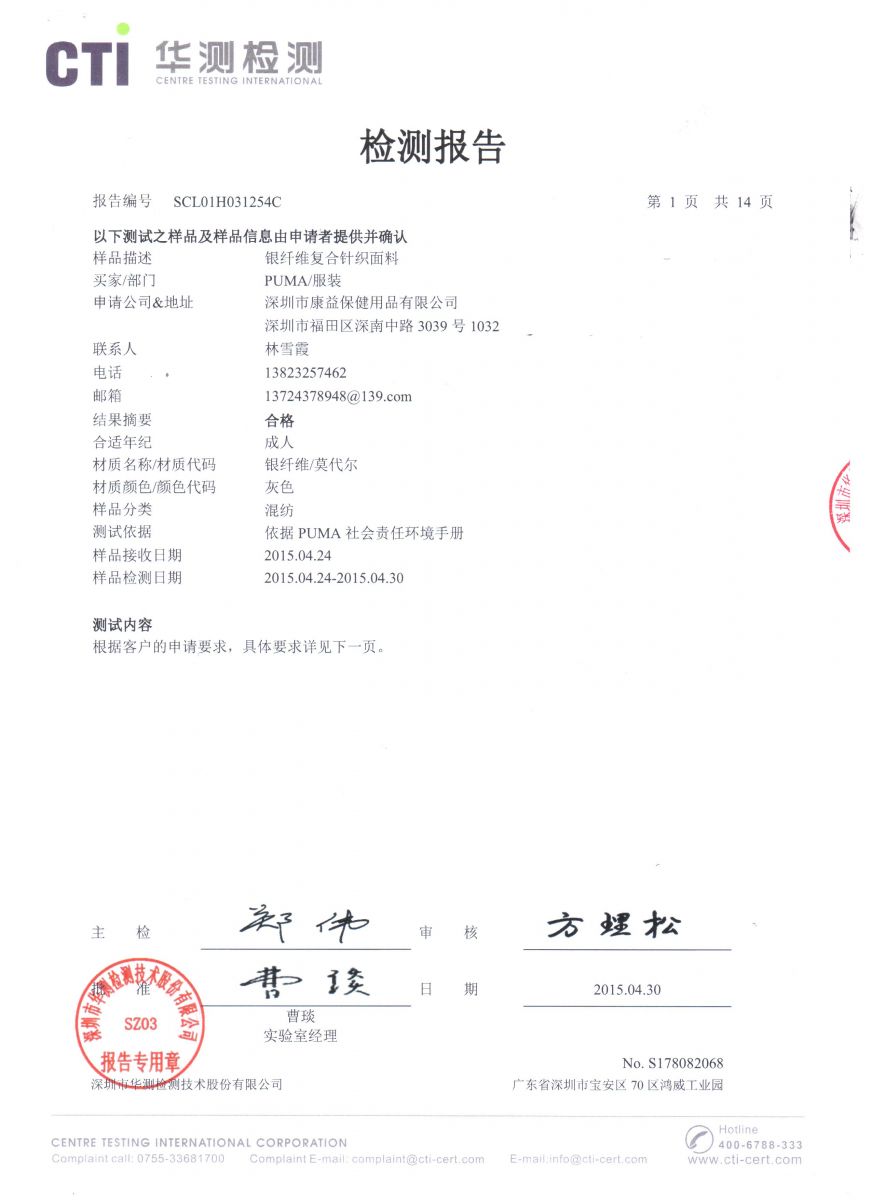 康益 銀纖維針織復(fù)合布環(huán)保檢測報(bào)告中文版
